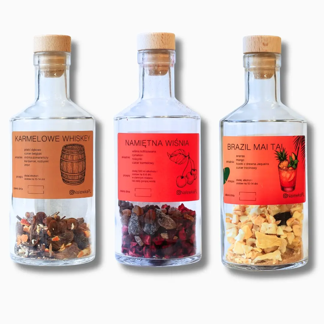 Do wyboru dostępne zestawy z butelkami ze składnikami do robienia nalewek na 1, 2, 3 lub 5 szt. w prezentowym opakowaniu.