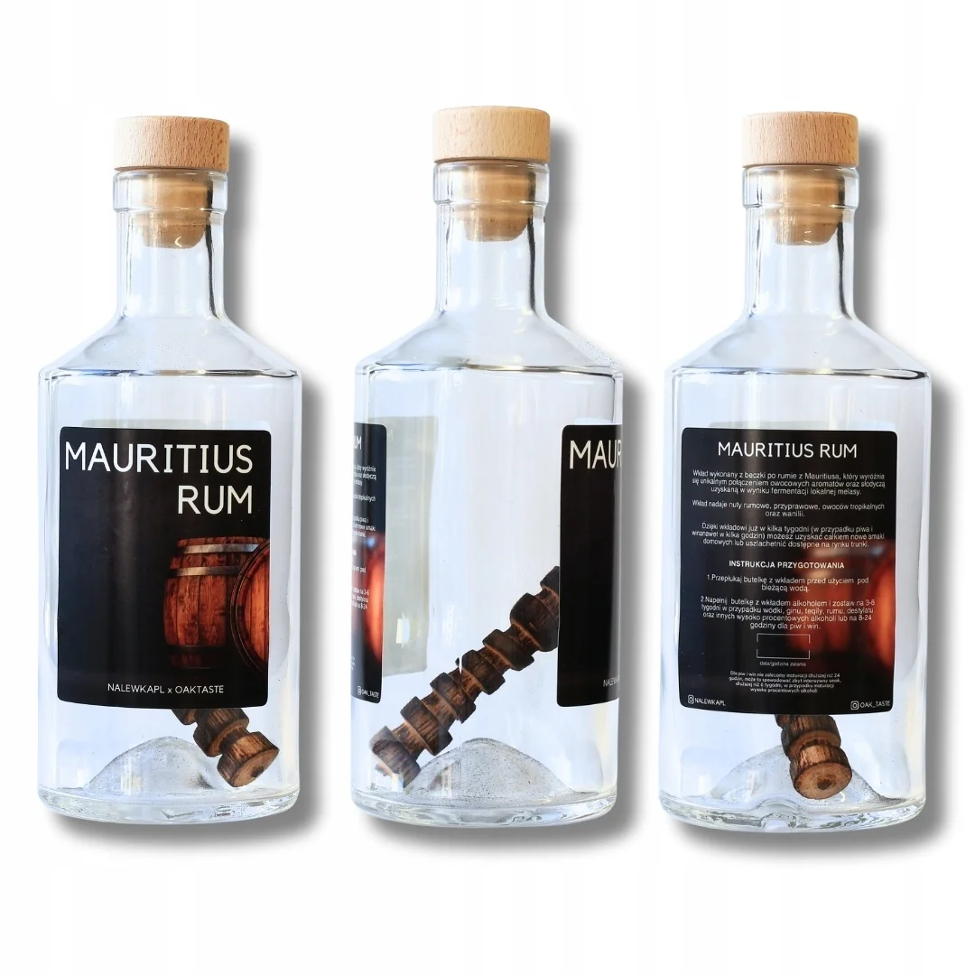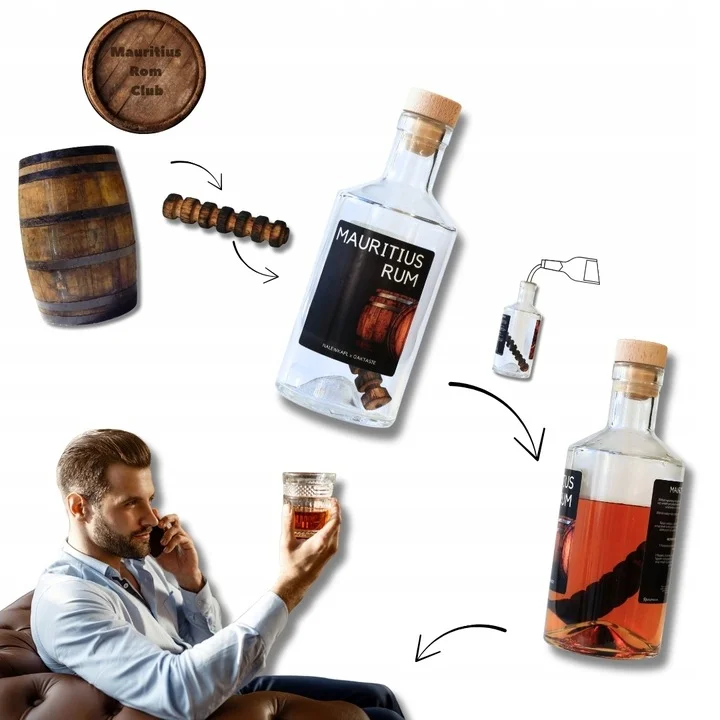 Wkład maturacyjny z beczki po rumie Rom Club z Mauritiusa w szklanej butelce premium z eleganckim opakowaniem to doskonały prezent dla męszczyzn, które cenią egzotyczne smaki i lubią eksperymentować z własnymi trunkami.