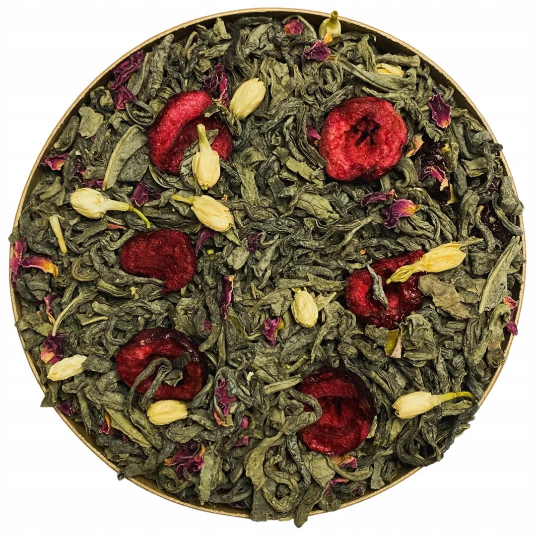 Składniki: herbata zielona sencha, herbata zielona gunpowder, wiśnia liofilizowana, płatki róży, pąki jaśminu, aromat.