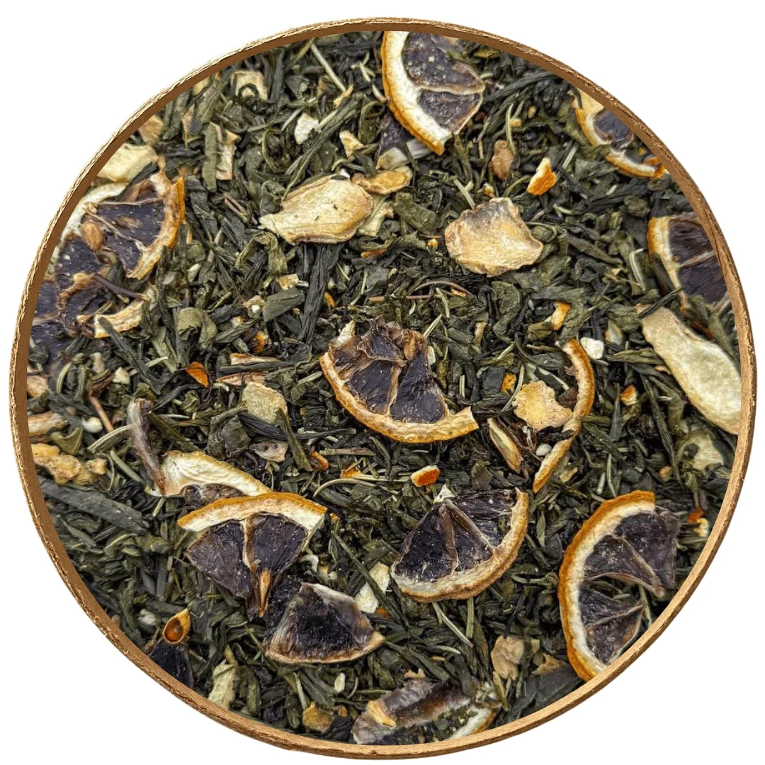 Zielona herbata o świeżym, pobudzającym charakterze i wyraźnie cytrusowym akcencie. Suszona cytryna i skórka pomarańczy wnoszą do naparu przyjemną lekkość i świeżość, a imbir dodaje delikatnej pikantności. Rozmaryn nadaje całości ziołową nutę, która doskonale współgra z owocowymi aromatami. Naturalne aromaty cytryny i rozmarynu podkreślają energetyczny charakter tej kompozycji. Idealna na początek dnia lub chwilę, gdy potrzebujesz odświeżenia i pobudzenia.