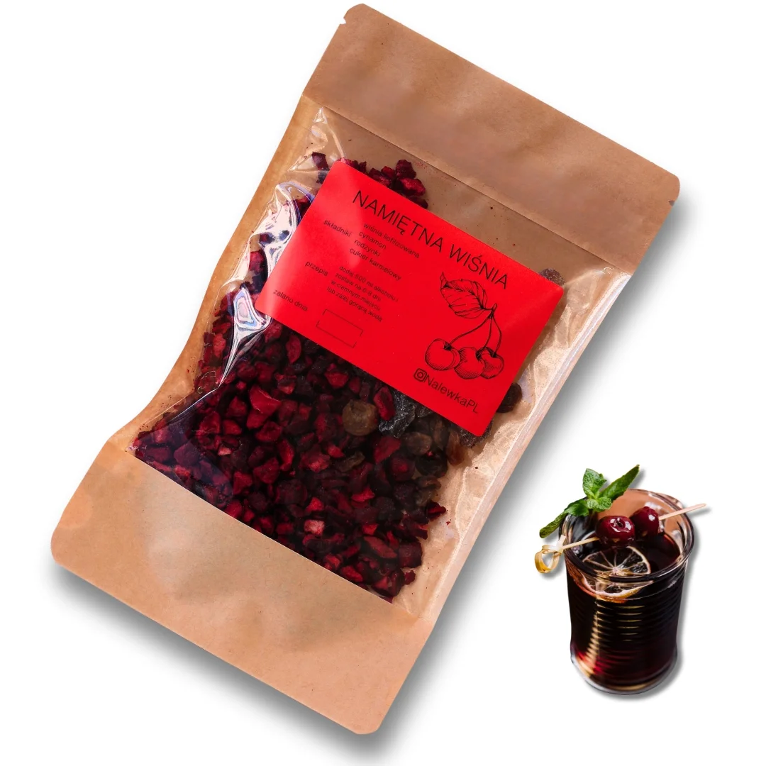 Zestaw NalewkaPL w praktycznej saszetce doypack to starannie skomponowana mieszanka liofilizowanej wiśni, rodzynek, belgijskiego cukru kandyzowanego i cynamonu. Zawartość saszetki wystarczy, aby przygotować 500–700 ml nalewki lub około 1 litra aromatycznego naparu.